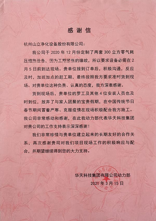 杭州山立凈化設備股份有公司收到一封來自華天科技集團有限公司感謝信。信中,華天科技集團有限公司主要對我司的設備生產(chǎn)團隊,售后服務團隊的全力支持和協(xié)助表示感謝。