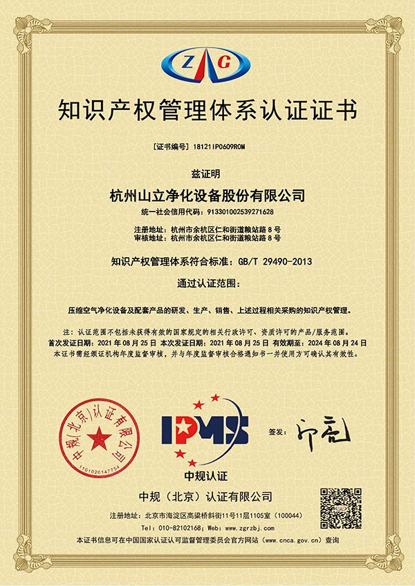 杭州山立凈化設備股份有限公司順利通過知識產(chǎn)權管理體系審核,并于2021年8月25日獲得由中規(guī)(北京)認證有限公司頒發(fā)的“知識產(chǎn)權管理體系認證”證書。
