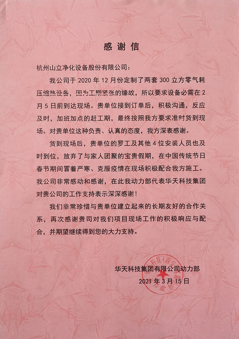 近日,杭州山立凈化設(shè)備股份有公司收到一封來自華天科技集團有限公司感謝信。信中,華天科技集團有限公司主要對我司的設(shè)備生產(chǎn)團隊,售后服務(wù)團隊的全力支持和協(xié)助表示感謝。我公司售后服務(wù)人員羅文博、王李、劉周洋和車間員工房立香、康等紅,他們放棄了春節(jié)假期,冒著嚴寒加班加點,,積極配合客戶安裝施工,安全、高效、優(yōu)質(zhì)地完成了安裝調(diào)試任務(wù)。他們勤奮敬業(yè)、踏實務(wù)實的工作精神,認真勤勉、專業(yè)務(wù)實的服務(wù)態(tài)度得到了客戶的認可與感謝。