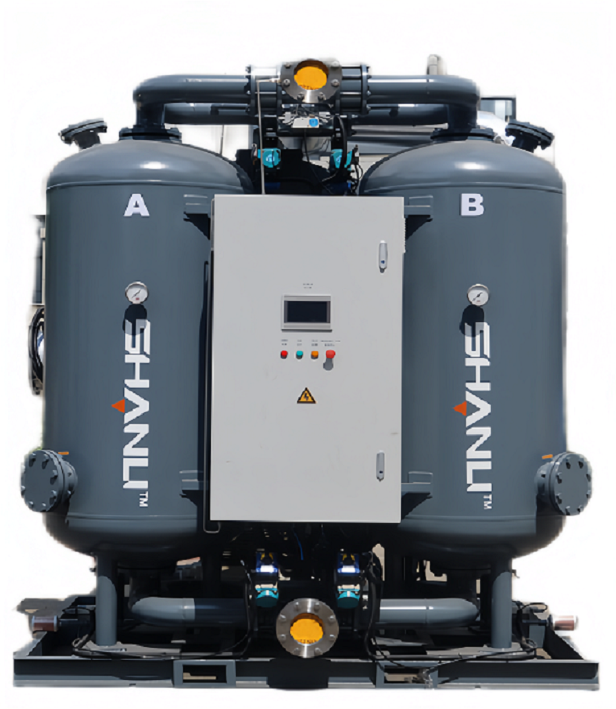 此方案通過(guò)對(duì)原設(shè)備系統(tǒng)基礎(chǔ)耗氣量的節(jié)能改造,徹底摒棄傳統(tǒng)耗氣模式,通過(guò)環(huán)境大氣加熱再生與高效熱循環(huán)系統(tǒng)設(shè)計(jì),實(shí)現(xiàn)全程無(wú)壓縮空氣消耗。具體運(yùn)作中,利用鼓風(fēng)機(jī)驅(qū)動(dòng)熱氣在封閉回路內(nèi)循環(huán),經(jīng)水冷換熱器精準(zhǔn)控溫,確保吸附劑高效再生同時(shí)降低能耗,最終實(shí)現(xiàn)設(shè)備耗氣量歸零,顯著優(yōu)化空壓站能效。