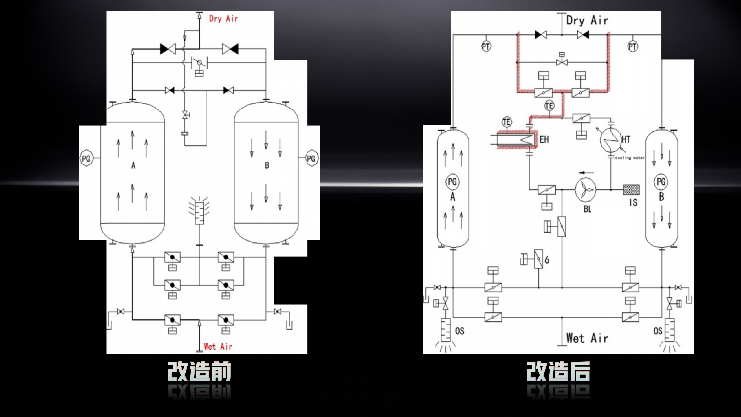 據(jù)了解,原設(shè)備為同行廠家 150 立方無(wú)熱再生吸附式干燥機(jī),我司經(jīng)深入現(xiàn)場(chǎng)工況分析,創(chuàng)新提出‘零氣耗鼓風(fēng)熱再生吸附式干燥機(jī)改造方案’。