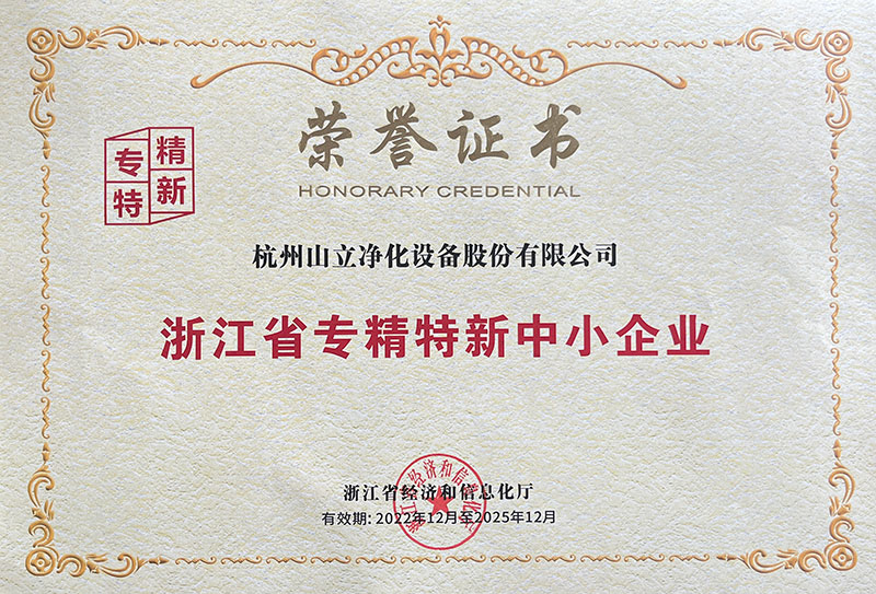 2023年,杭州山立被浙江省經(jīng)濟(jì)和信息化廳評(píng)定為浙江省“專精特新”中小企業(yè)。此次被認(rèn)定為浙江省“專精特新”中小企業(yè),該稱號(hào)是對(duì)杭州山立凈化技術(shù)創(chuàng)新、產(chǎn)品服務(wù)、經(jīng)營(yíng)發(fā)展及綜合實(shí)力等方面的認(rèn)可和肯定。